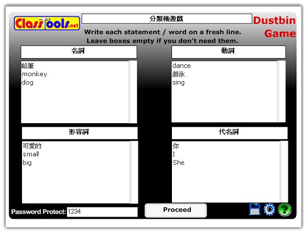 games 分類桶遊戲的設定很簡單,打上遊戲名稱、四個分類的名稱、分類底下有哪些項目,這樣就可以了!超簡單的對吧?