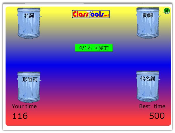 - 我認為這個遊戲的好處是,如果學生分類錯誤,並不是反應說錯了,而是讓你丟不進去,一直到丟對桶為止,這樣不管學生程度如何,上臺時總是可以完成,臺下的學生也可以趁此機會學習。